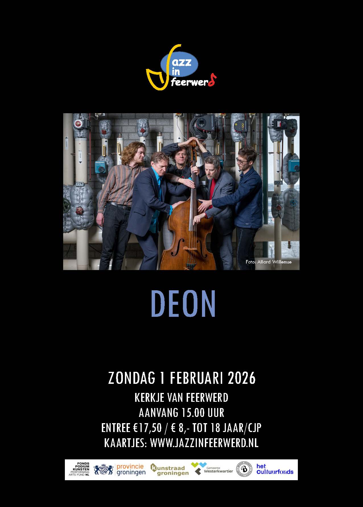 DEON is een van de nieuwste projecten van bassist Dion Nijland met kopstukken uit de Utrechtse jazzscene. Hierin combineert hij ervaren muzikanten als saxofonist Ad Colen en klarinettist Steven Kamperman met energieke jonge talenten als trompettist Ruben Drenth en drummer/vibrafonist Mees Siderius. Het resultaat is een fris geluid: gedurfd, avontuurlijk, eigentijds en toegankelijk. ‘De muziek mag knetteren, intiem zijn, schuren en ontroeren; zolang er maar op het scherpst van de snede gespeeld wordt’, aldus Dion.